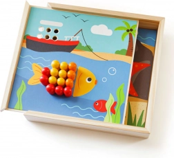 A Fa mozaik Tengerpart BIGJIGS TOYS kreatív kirakást kínál a gyerekeknek színes pöckökkel. Helyezd el őket sablonok szerint vagy saját fantáziád alapján, és alkoss vidám tengerparti motívumokat. A kompakt doboznak köszönhetően, amely alapként is szolgál, a játék mindig átláthatóan elpakolható és bármikor használatra kész.