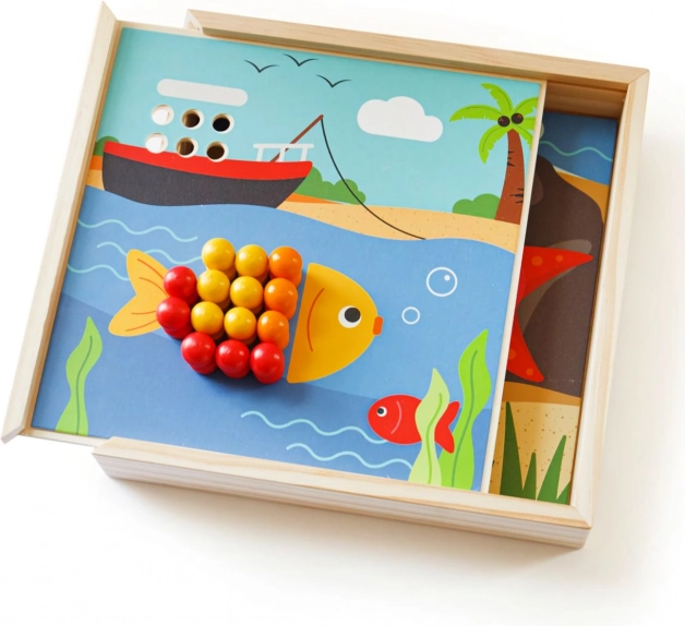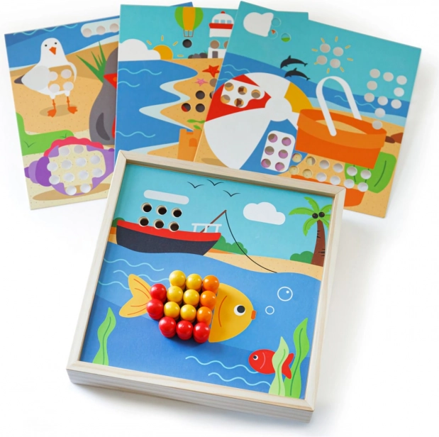Fedezze fel a tengerparti motívumú, szórakoztató mozaikot, amely fejleszti a gyerekek fantáziáját és készségeit. Tartalmaz 4 képet és 96 pöcköt 8 színben, amelyeket a praktikus doboz fedelére lehet kirakni. A játék támogatja a színek felismerését, a finommotorikát, a koncentrációt és a logikus gondolkodást. Minőségi, felelősen beszerzett fából készült – kellemes tapintású és ideális utazáshoz.
