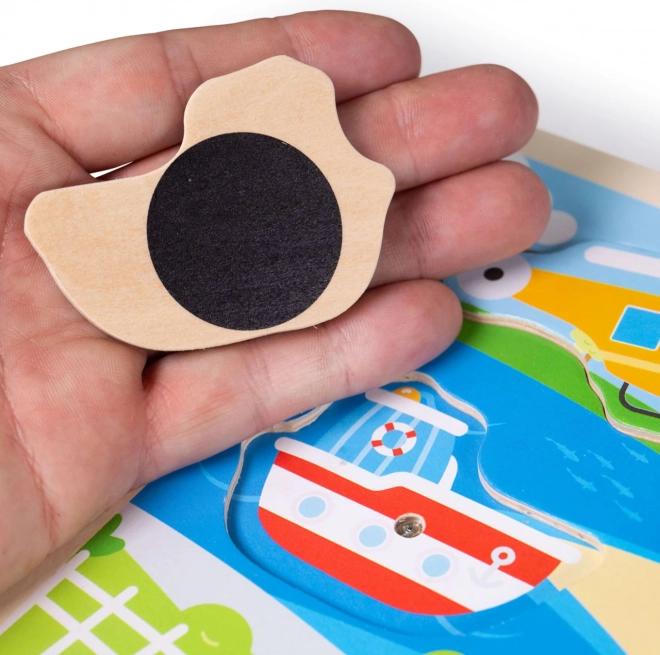 Szórakoztató fa kirakó gyerekeknek közlekedési eszközökkel, amely a darabok helyes elhelyezése után a megfelelő gép jellegzetes hangját játssza le, így fejlesztve a gyerekek kognitív képességeit.