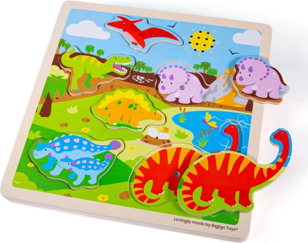 A Dinoszaurusz puzzle szf3rakoztatf mf3don f6sztf6nzi a gyerekeket a tanule1sra. A fa darabok ergonomikusan vannak tervezve a kicsi kezek e1ltal kf6nnyen kezelhetfek. Szedngazdag megjelene9sfckkel e9s aranyos hangeffektusaikkal azonnal felkeltik a gyerekek figyelme9t.