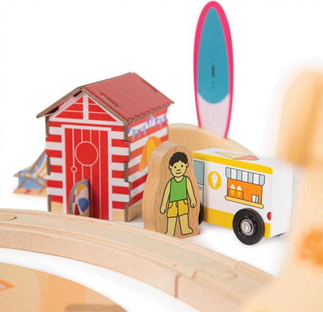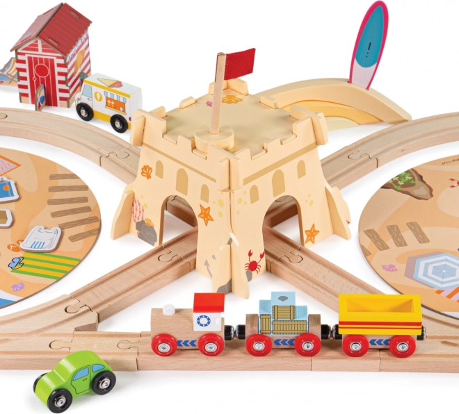 Indulj a napfényes tengerpartra ezzel a tematikus fa vonatpályával, és tanítsd meg a gyerekeknek, hogyan gondoskodjanak helyesen a természetről. A szett 70 darabot tartalmaz, köztük egy 3 részes vonatot, autókat, egy átjáróval ellátott homokvárat és tengerparti házikókat. Nem hiányoznak a mágneses szemléltető táblák sem a hulladék szelektálásához, amelyek fejlesztik a finommotorikát, a megismerő képességeket és a fenntartható szemléletet a játékban.