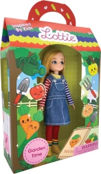 - LOTTIE kertész baba, csíkos pulóverke, farmer ruha, piros harisnya, sárga gumicsizma, kis lapát, gereblye, locsolókanna, 2 dobozka
