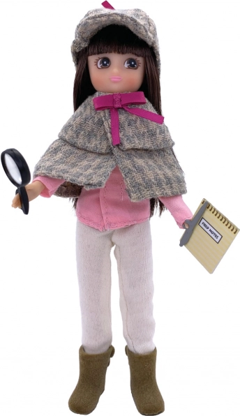 - Detektív modell: kockás barna-zöld kabát rózsaszín masnival, sapka, rózsaszín ing, bézs nadrág, barna cipő, jegyzettömb, toll és ujjlenyomat matricák.