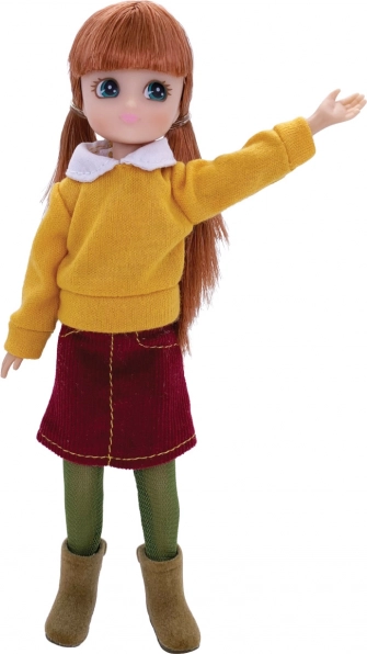 Baba őszi öltözékben - sárga pulóver, piros szoknya, zöld harisnya és barna cipők. Ideális őszi sétákhoz.