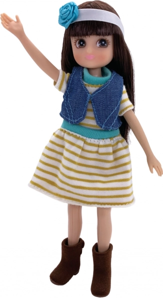 - Tavaszi modell: csíkos barna-fehér ruha, farmer mellény, barna cipők, kék virágos fejpánt
