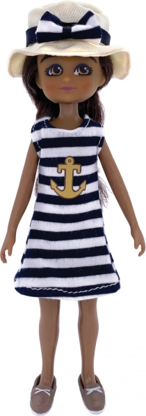 Baba tengerész-témájú ruhában és hozzáillő kiegészítőkkel, készen áll a nyári kalandokra.