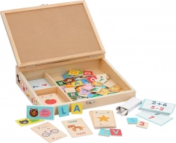 - Tábla, 2 kréta, 70 fa elem (betűk, számok, jelek), 80 szókártya, 30 számtani feladatkártya, 12 pontozókártya