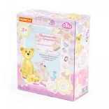A sárga, pöttyös ruha, a puha formák és a tartós anyagok biztonságos és vonzó játékot biztosítanak 3 éves kortól.