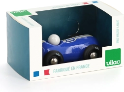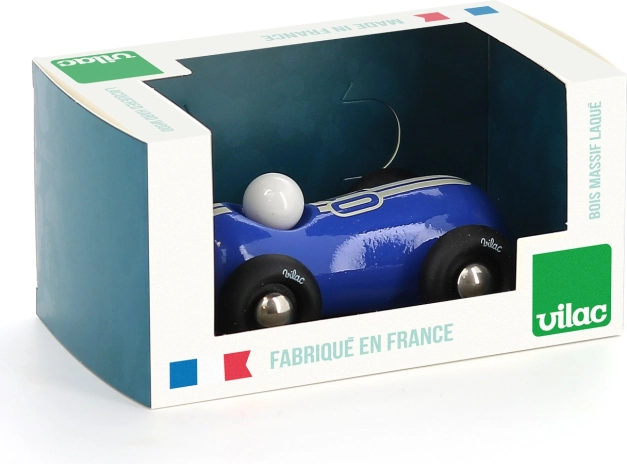 A kék színű Vilac Streamline PM versenyautó időtálló, kellemesen lekerekített dizájnjával és precíz kivitelezésével hódít. A fa karosszéria hagyományos, merítéses lakkozási eljárással készül, amely tartós és egyenletes felületet biztosít. A simán futó műanyag kerekekkel öröm a vezetés – akár a padlón, akár polcon, stílusos dekorációként.