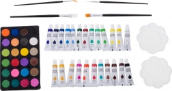 - 33× filctoll, 28× színes ceruza, 4× ecset, 2× grafitceruza, 2× radír, 2× műanyag paletta, 1× hegyező, 24 rekeszes akvarell paletta, 24× tubusos festék, 24× olajpasztell, bőrönd