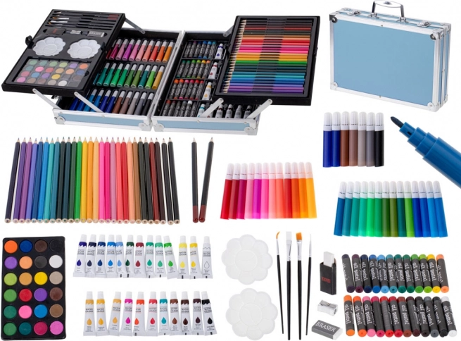 Univerzális képzőművészeti készlet praktikus bőröndben, amely mindent kínál kicsiknek és nagyoknak. Széles szín- és eszközválasztékot találsz benne rajzoláshoz és festéshez – filctollaktól és színes ceruzáktól az akvarelleken, tubusos festékeken át az olajpasztelekig. Kompakt kék bőrönd masszív csatokkal, amely mindent átláthatóan a helyén tart, és ideális otthonra, iskolába vagy utazáshoz. 145 darab a határtalan kreativitásért és a képzelet fejlesztéséért.