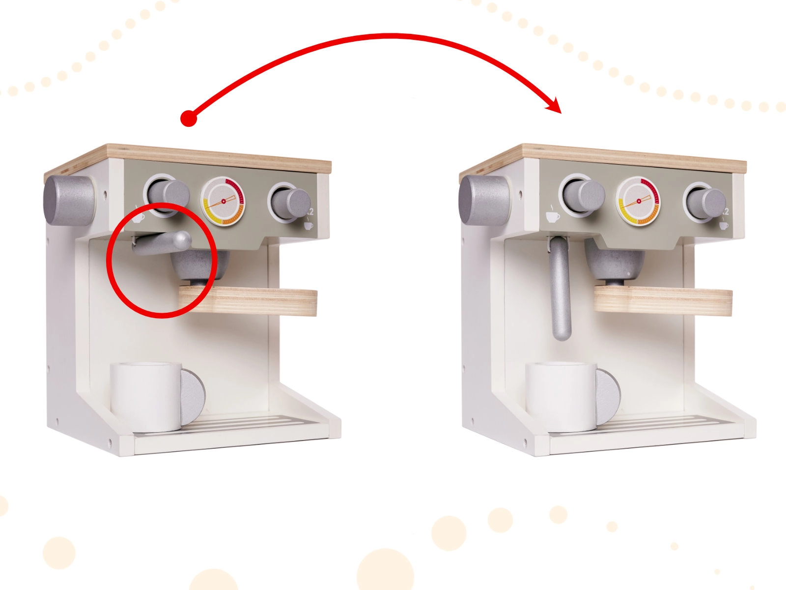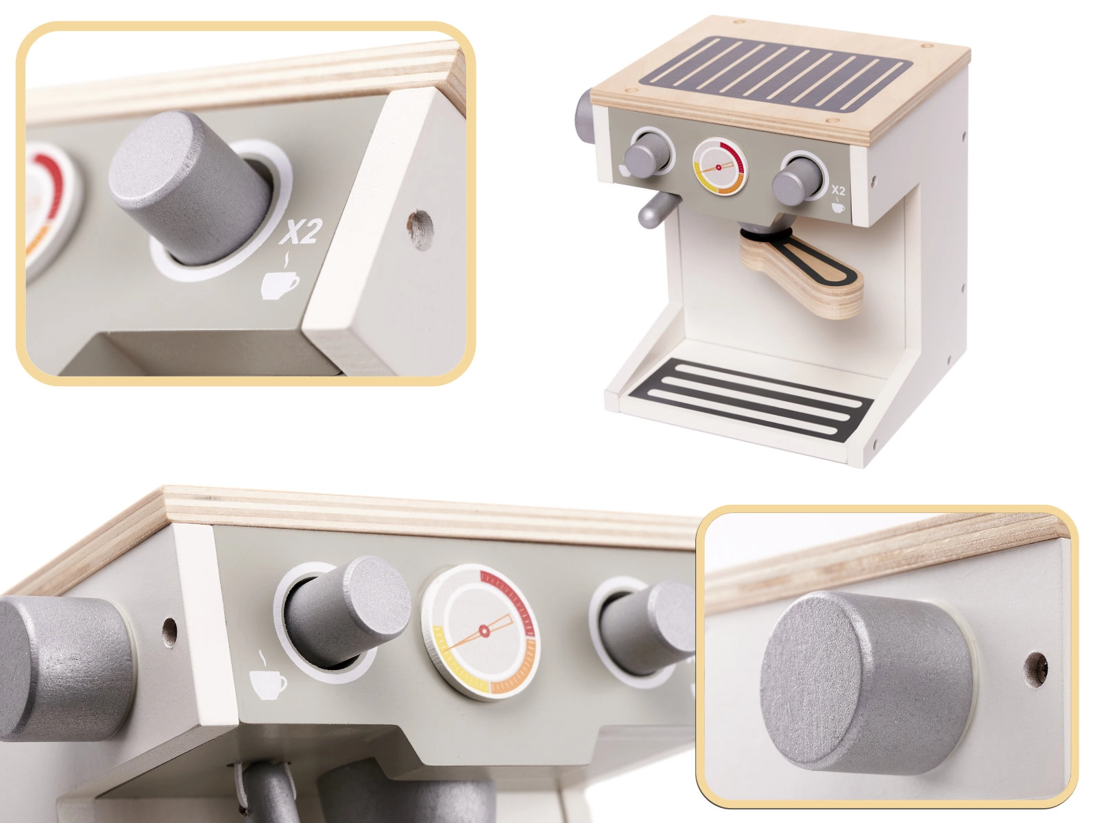 A gyerekek számára készült fa kávéfőző tökéletes módja annak, hogy ösztönözzék kreativitásukat és segítsenek megtanulni a felnőttek kávékészítési szokásait. Ez a kivételes kávéfőző valósághű funkciókat tartalmaz, mint a portafilter és az állítható gombok, amelyek lehetővé teszik a kávéfajták kiválasztását. A gyerekek még tejeskávét is készíthetnek az integrált tejhabosítóval.