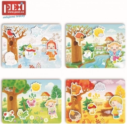 Mikor készítünk hógolyókat? Mikor mehetünk az erdőbe bogyókat és gombát gyűjteni? A készlet 4 nagy, rugalmas, tépőzáras műanyag táblát és 20 önálló elemet tartalmaz, amelyeket tépőzárral rögzíthet a táblákra. Ennek a praktikus megoldásnak köszönhetően az egyes elemek nem esnek le könnyen, és a megfelelő helyen maradnak.
