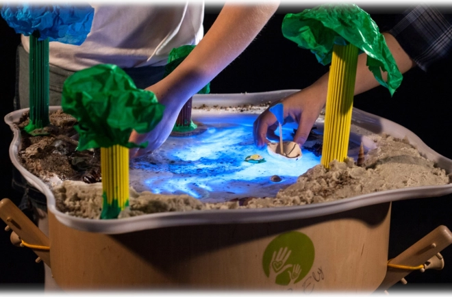 A kád ideális textúrák felfedezéséhez, öntögetéshez, tavacskák és szigetek építéséhez. Támogatja a finommotorikát és a koncentrációt.