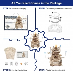 Fedezze fel az univerzum varázsát ezzel a precíz 3D orrery Naprendszer-modellel. Szerelje össze a kézi meghajtású, működő fa orreryt, ahol a bolygók különböző sebességgel keringenek, és LED Nap világít. A lézerrel vágott rétegelt lemezből készült modell interaktív mechanikát, oktatási élményt és stílusos dekorációt kínál egyben.