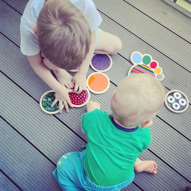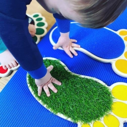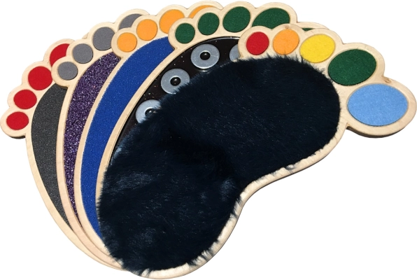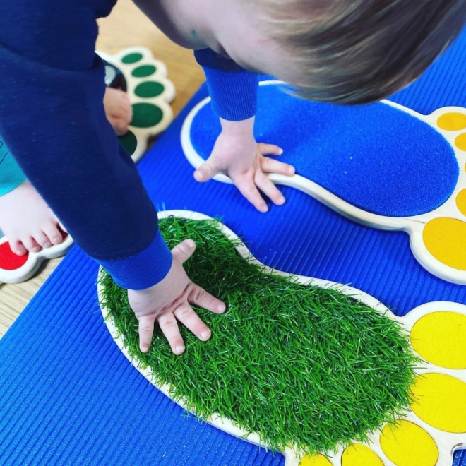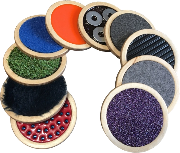 A készlet számos típusú felületet tartalmaz, mint például filc, szilikonhab, műfű és más, amelyek segítenek fejleszteni a tapintást és a finommotorikus készségeket.