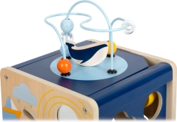 A kocka olyan interaktív elemeket kínál, mint a gyöngyös labirintusok, útvesztők és formarakosgatók, amelyek segítik a színek és formák felismerését.