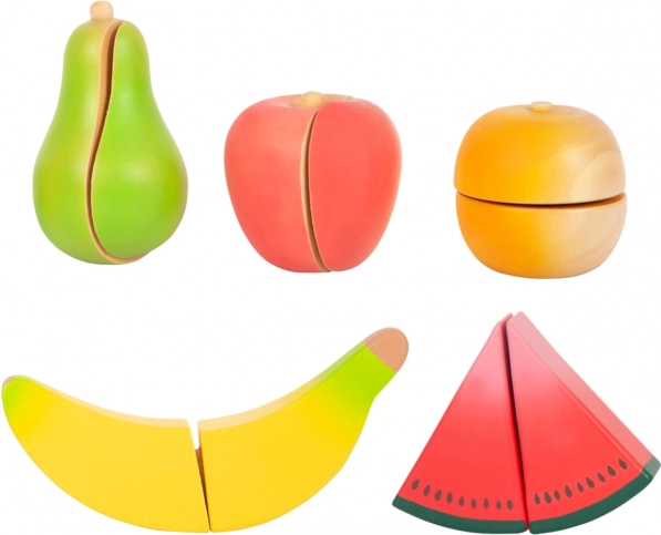 Színes fa darabok (alma, körte, banán, narancs, dinnye), melyek a tépőzárnak köszönhetően könnyen szét- és összepattinthatók – ideálisak a helyes vágási technika gyakorlásához.