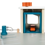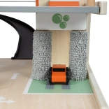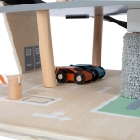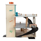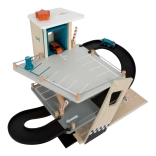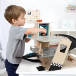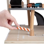 Ez a dizájnos fa versenygarázs gazdagon felszerelt játékvilágot kínál a gyerekeknek. A három szintet működő lift és két sima rámpa köti össze, amelyek lehetővé teszik a kisautók folyamatos mozgását. Minden szint mechanikus sorompóval és gumírozott ütközővel rendelkezik, ami fokozza a dinamikát és megakadályozza a járművek kiesését. A színes ikonok és közlekedési jelzések játékos tanulást és a képzelet fejlesztését támogatják.