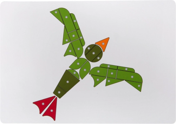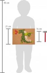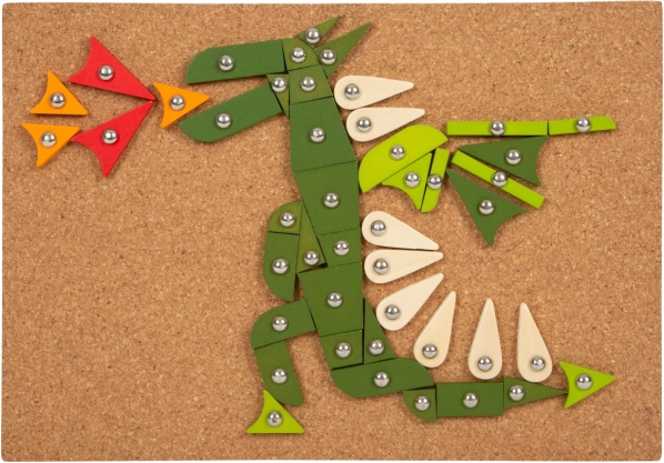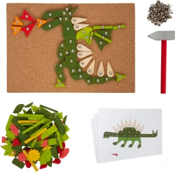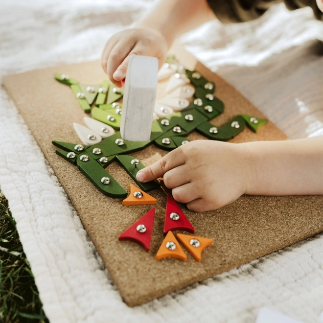 A készlet tartalmaz parafa alátétet, fa kalapácsot, színes darabokat és gombostűket, hogy képeket lehessen alkotni.