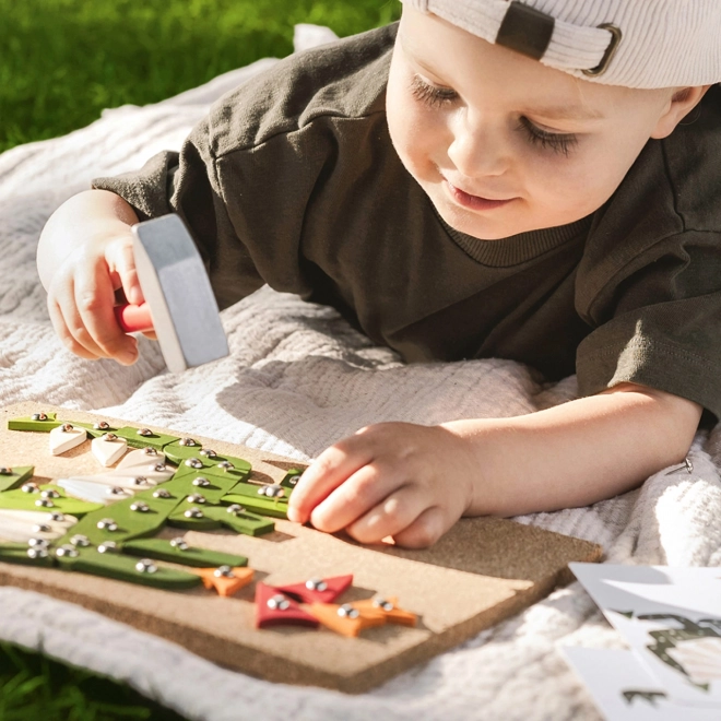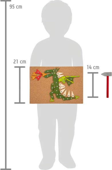 Ez a kalapálós játék ideális a fantáziával rendelkező kis felfedezőknek. Fejleszti a motorikus készségeket és támogatja a kreativitást. A készlet különböző formájú és színű darabokat tartalmaz, amelyeket könnyen bele lehet kalapálni a parafa alátétbe.