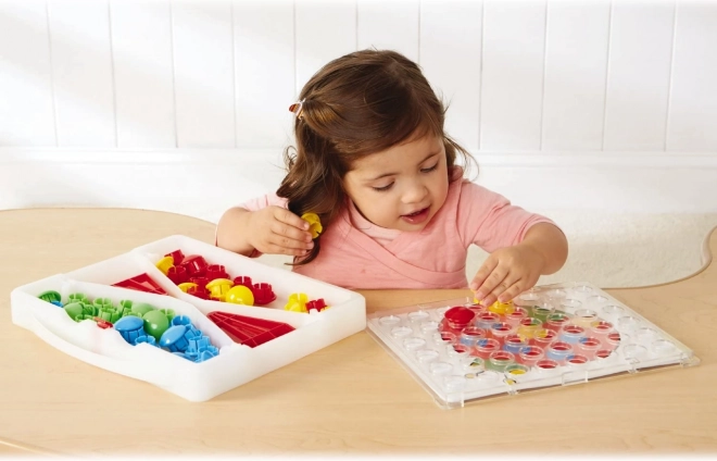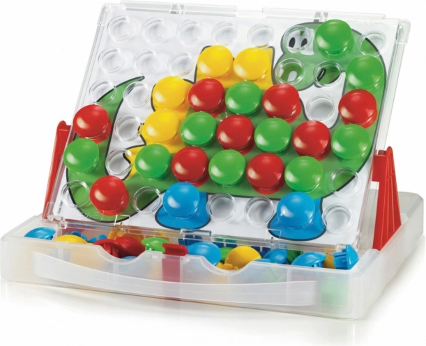 A mozaik a praktikus bőröndben lehetővé teszi, hogy a gyerekek vidám képeket rakjanak ki a mellékelt sablonok vagy saját ötleteik alapján. A táblát az oldaltámaszokba csúsztatva függőlegesen is használható a még kényelmesebb játékért. A nagy, színes szegecsek biztonságosak és a legkisebb kezek számára is könnyen megfoghatók.