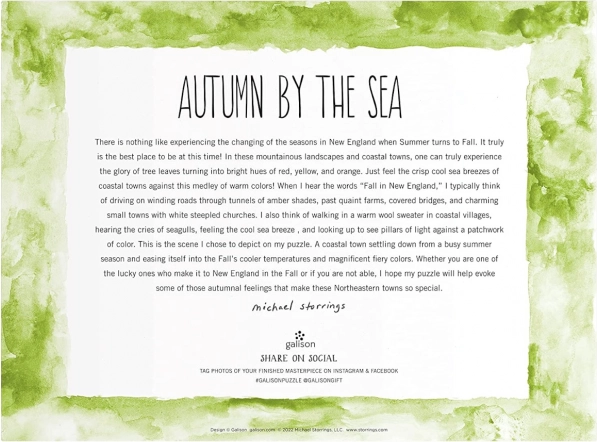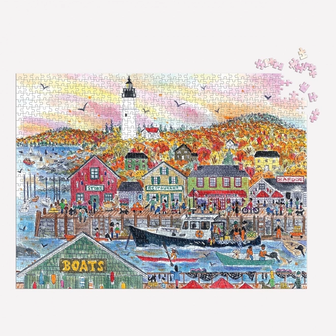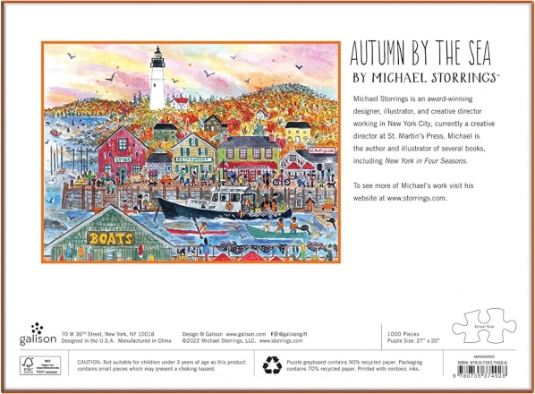 Élvezze a színes lombot, a világítótornyot és a nyüzsgő kikötőt, amelyet a díjnyertes illusztrátor, Michael Storrings örökített meg. A motívum tele van részletekkel, amelyeket minden kirakásnál élmény felfedezni.
