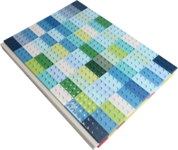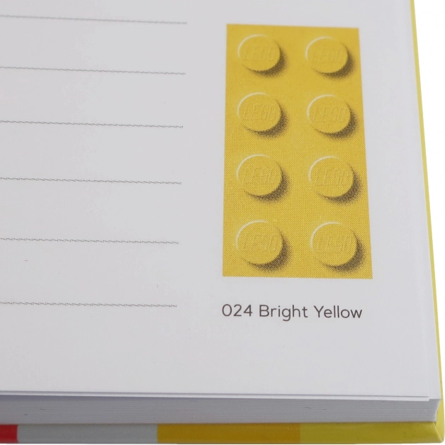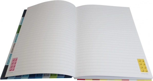Minden vonalas oldalon egy LEGO elem látható egy konkrét árnyalatban, ami kellemesebbé teszi az írást és ösztönzi a kreativitást.