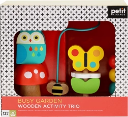 Petit Collage motorikus labirint Kert Activity Trio egy gyönyörűen kidolgozott fa játék, amely háromféle tevékenységet kínál. A gyerekek élvezhetik az állatfigurák és más elemek felhelyezését, mozgatását és forgatását. Egyszerű, mégis vonzó dizájnja támogatja a kognitív képességek és fantázia fejlődését.