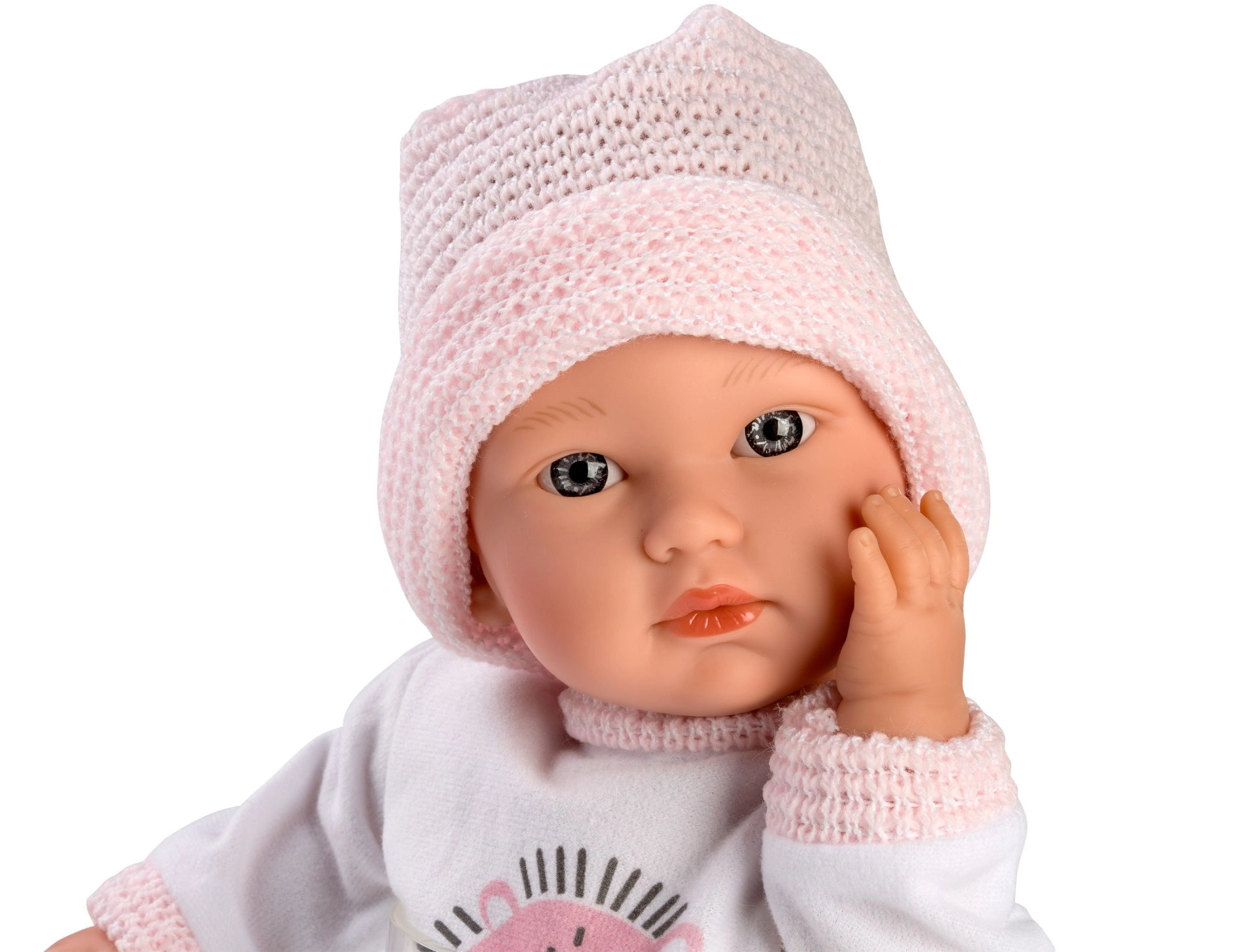 A pocak megnyomására a baba sírdogál és megszólal: „anya, apa”, ezzel támogatva az empatikus játékot és a szociális készségek fejlődését. A kedves mintás öltözet és a kötött sapka könnyen fel- és levehető, ami fejleszti a finommotorikát.
