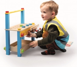 A készlet fa- és műanyag szerszámokat tartalmaz – fűrész, csavarhúzó, csőfogó, kalapács, védőszemüveg és igazolvány. A gyerekek így utánozhatják az építők munkáját, és fejleszthetik finommotorikájukat.