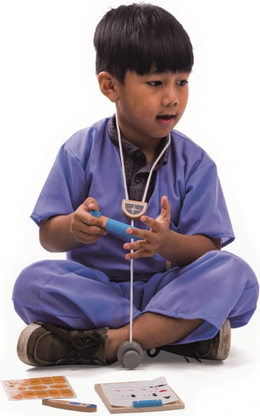 A BIGJIGS TOYS gyerek orvosi jelmeze minden játékot mentőakcióvá varázsol. A készlet része egy kék póló és tépőzáras nadrág az egyszerű fel- és levételhez, valamint gazdag kiegészítők: fa sztetoszkóp, jegyzeteléshez orvosi írótábla, hőmérő, zsebóra, injekciós fecskendő és sebtapaszok. A jelmez pamutból és poliészterből készült, és géppel mosható.