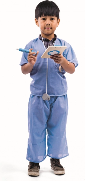 - Póló, nadrág, fa sztetoszkóp, orvosi írótábla, hőmérő, zsebóra, injekciós fecskendő, sebtapaszok