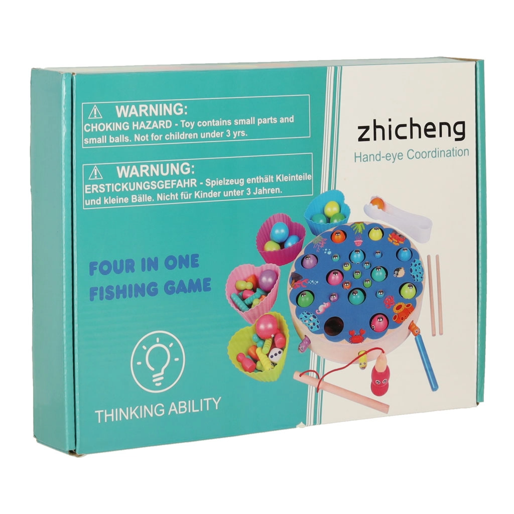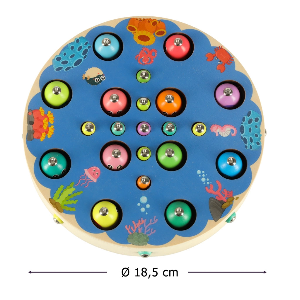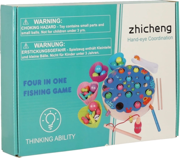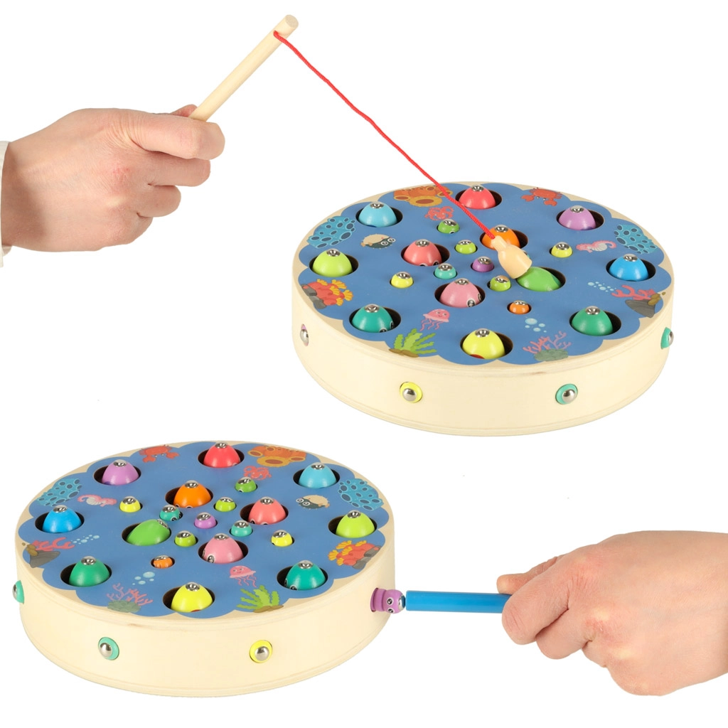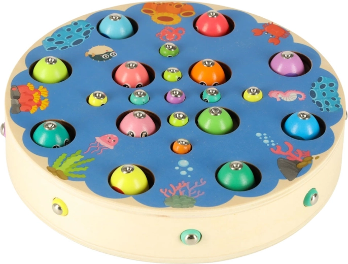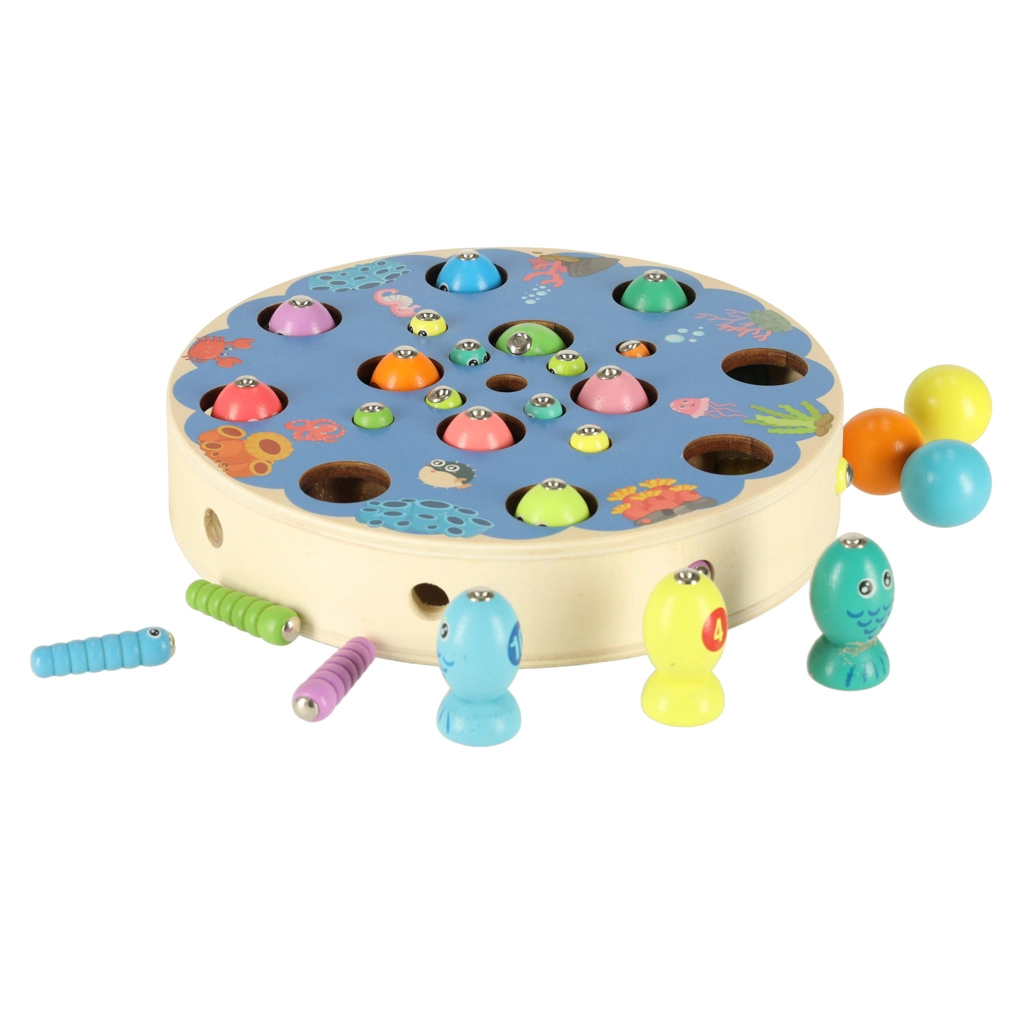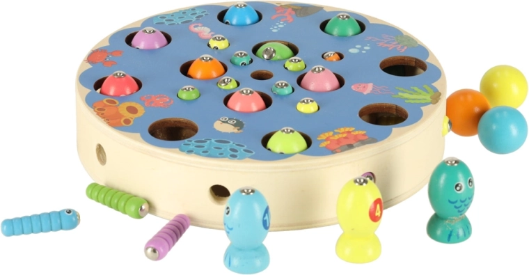 A gyerekek színes halakat és hernyókat fognak ki mágneses horgászbotokkal – játékos formában gyakorolják a pontosságot, a türelmet és a kéz-szem koordinációt.