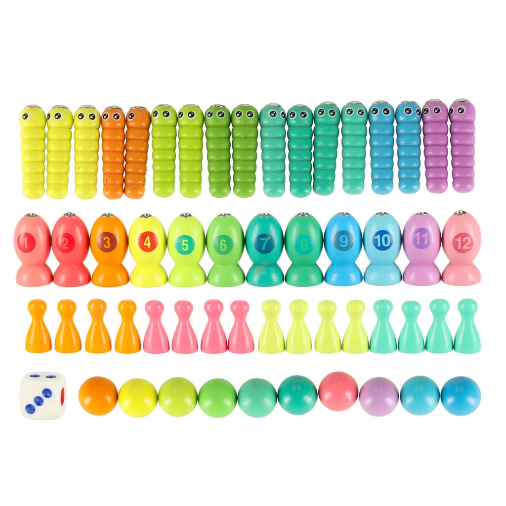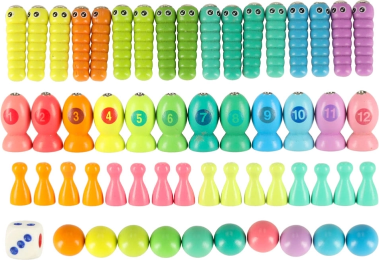 - 1× fa alap, 2× horgászbot, 2× pálcika, 1× csipesz, 4× szilikon tálka, 10× fa golyó, 12× halacska, 17× hernyó, 16× bábu 4 színben, 1× dobókocka