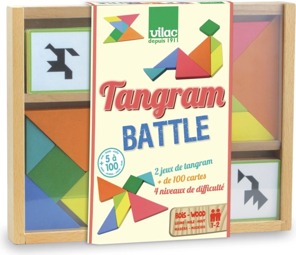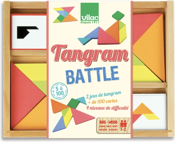 A VILAC Tangram párbaj gyors és izgalmas társasjáték, amely logikát, koncentrációt és kreativitást fejleszt. A cél, hogy a színes elemekből a lehető leggyorsabban kirakd a kártyán látható sziluettet. A különböző nehézségi szinteknek köszönhetően az egész család élvezheti.