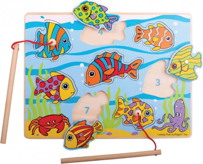 - Teljes készlet: fa tábla, mágneses horgászbot és halacskák – összesen 10 elem