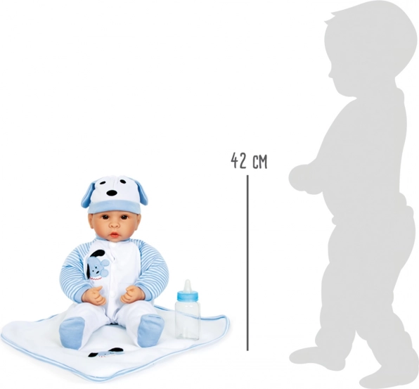 Panenka Beno ideális társ minden kutyákat szerető gyermek számára. Ez a valósághű baba egy aranyos kék-fehér, kölyökkutyás mintázatú ruhában van öltöztetve, és mellé cumisüveg és cumi is tartozik.