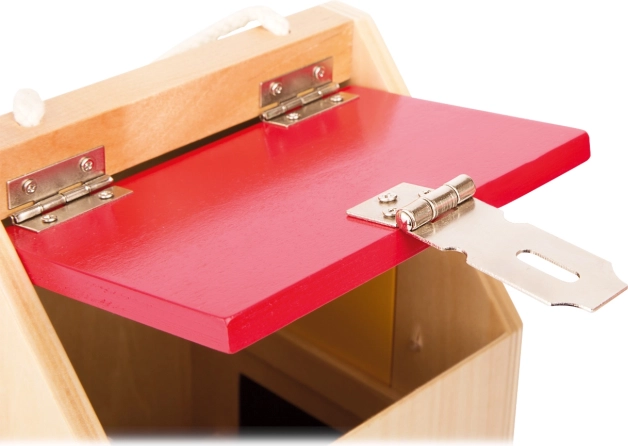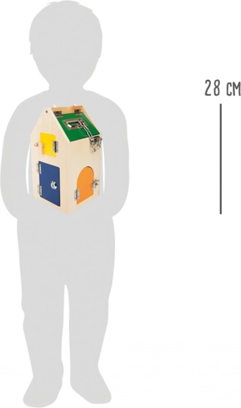 A házikó minőségi fából, erős fémrészekkel készül, ezért intenzív használat mellett is tartós. Kompakt méretének és praktikus fogantyújának köszönhetően könnyen hordozható – ideális utazáshoz, óvodába vagy a gyerekszobába. A színes elemek felfedezésre csábítanak és segítik a színek felismerését.