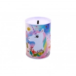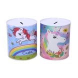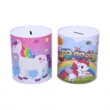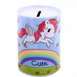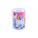 Ez a fém persely egyszarvú mintával ideális gyerekeknek, akik szeretnék megtakarítani pénzüket kedvenc játékukra. Kiemelkedik dekoratív dizájnjával és praktikus nyílással a tetején az érmék behelyezéséhez.