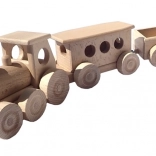 Fa személyvonat megörvendezteti a kis vonat rajongókat. A modell kiváló minőségű bükkfából készült természetes megjelenéssel, amelyet nem kezeltek vegyi anyagokkal.