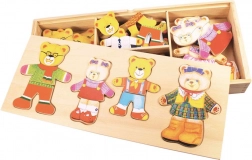 Öltöztesd fel Mackó urat, Mackónét és két bocsukat a legkülönfélébb szettekbe, és fedezzétek fel az érzelmeket a cserélhető, különböző arckifejezéseket ábrázoló fejekkel. A fa elemek kellemes tapintásúak, könnyen összeilleszthetők, és támogatják a kreatív játékot, a játékos tanulást.
