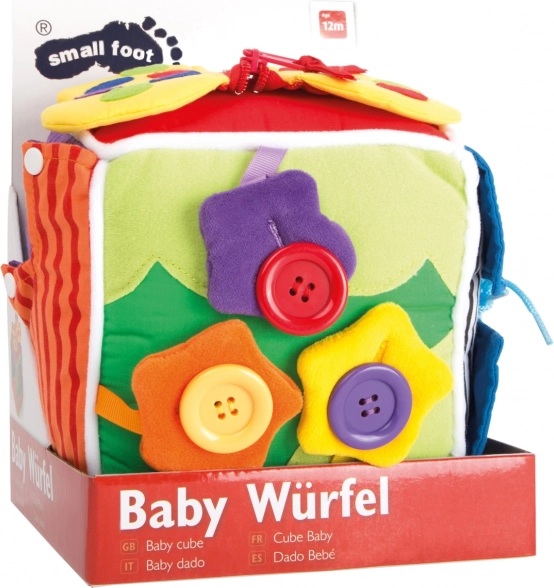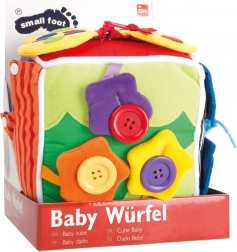 Plüss aktivitási kocka a Small Foot-tól ideális játék a finommotorika fejlesztéséhez gyerekeknél. Különböző típusú záródásokat tartalmaz, mint gombok, cipzárak és zsinórok, amelyek támogatják a tapintási felfedezést.