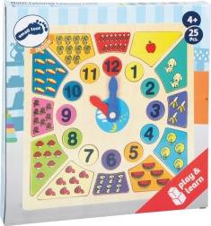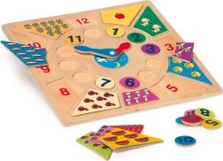 A „Tanuld meg az órát” fa bedugós kirakó játékos eszköz, amellyel a gyerekek könnyedén elsajátítják az idő leolvasását és a mennyiségek felismerését. A kivehető, számos elemeket a megfelelő helyre kell visszahelyezni, ami fejleszti a koncentrációt és a szem–kéz koordinációt.