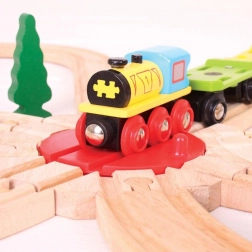 A Bigjigs Rail fordítókorong felelősen beszerzett természetes anyagokból készül, és teljes mértékben kompatibilis a legtöbb, széles körben elérhető fa vonatpályával. A precíz kivitelezés biztosítja a sima működést és a sínek könnyű csatlakoztatását.
