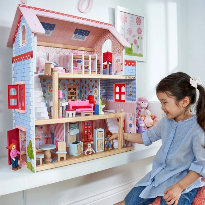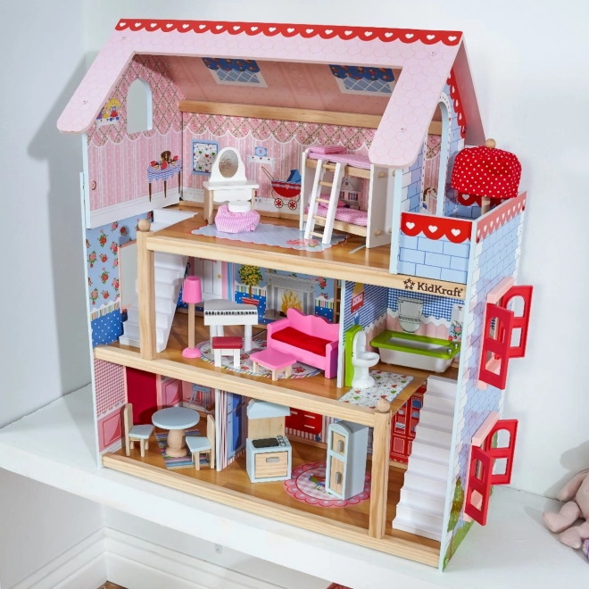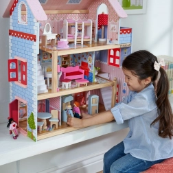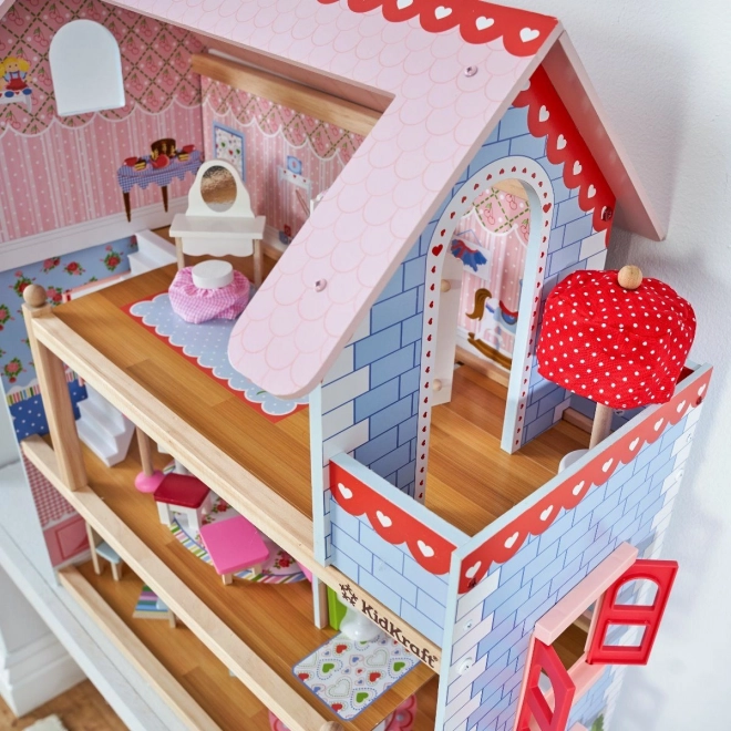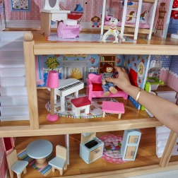 A babaház 3 szintet és 5 szobát kínál erkéllyel – ideális tér az alkotó játékhoz és saját történetek megalkotásához.
