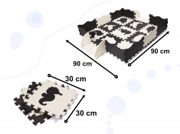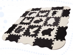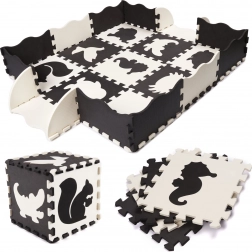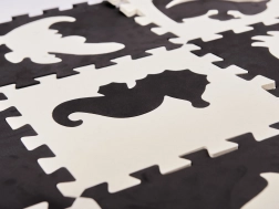 Nagy hab puzzle fekete és fehér színben, kivehető elemekkel és érdekes formákkal biztosítja a nagyszerű szórakozást a világot felfedező gyermek számára. A puzzlenak köszönhetően biztonságos játszóteret lehet kialakítani, ahol a puha hab minden esést csillapít.
