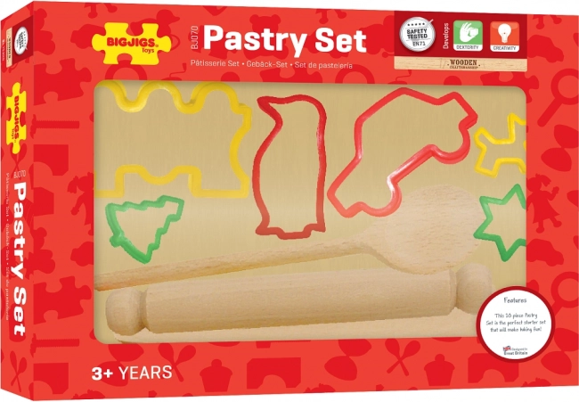 Ez a BIGJIGS sütőkészlet kiszúróformákkal remek segítőtárs a kis szakácsok és cukrászok számára. A fa eszközök és a színes kiszúróformák kombinációjának köszönhetően a gyerekek elsajátítják a sütés alapjait, és fejlesztik finommotorikájukat, illetve kéz–szem koordinációjukat. A minőségi kivitel és a biztonságos anyagok kényelmes, gondtalan játékot biztosítanak.