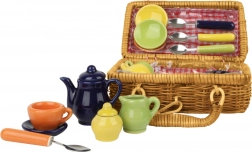 A kerámia edények és evőeszközök remek színekben minden pikniktakaró valódi díszei. A készlet négy színes kanalat, csészéket és csészealjakat, egy tejszíntartót, egy cukortartót és egy kávéskannát tartalmaz. A piros-fehér kockás anyaggal bélelt piknikkofferben minden darab jól elfér. Főbb jellemzők: a 17 darabos edénykészlet praktikus kis bőröndben van elhelyezve, színes dizájnú kerámia edényekkel.