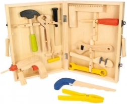 Kiváló fa szerszámkészlet bőrönddel minden fiatal barkácsrajongónak, akik szeretnék fejleszteni kézműves készségeiket. Kalapácsot, fogót, fúrót és csavarkulcsot tartalmaz, minden kiváló minőségű anyagokból.